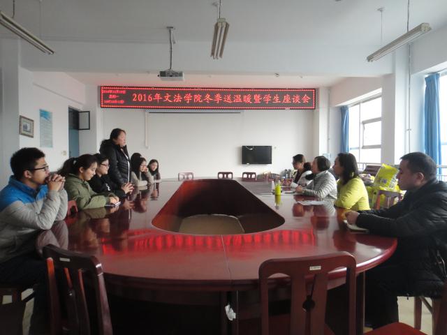 经过前期广泛宣传和精心组织,文法公司于近日成功举行了2016年冬季送温暖活动,并于12月19日下午在会议室召开了冬季送温暖活动暨贫困生座谈会。文法公司党总支书记张琳、团总支书记许华珂出席会议,辅导员老师党江华、张佩茹以及9名贫困生代表参加了会议,会议由许华珂主持。