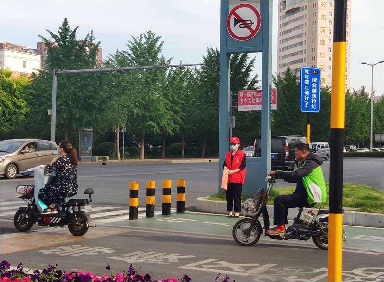 活动中,老师们身着志愿者服装,手持交通引导旗,协助执勤交警疏导交通、维护交通秩序,劝阻不文明交通行为,重点是行人和非机动车闯红灯、抢信号灯和逆行现象。同时,对市民开展交通法规和交通安全常识的面对面宣传,引导广大市民自觉遵守交通法规。