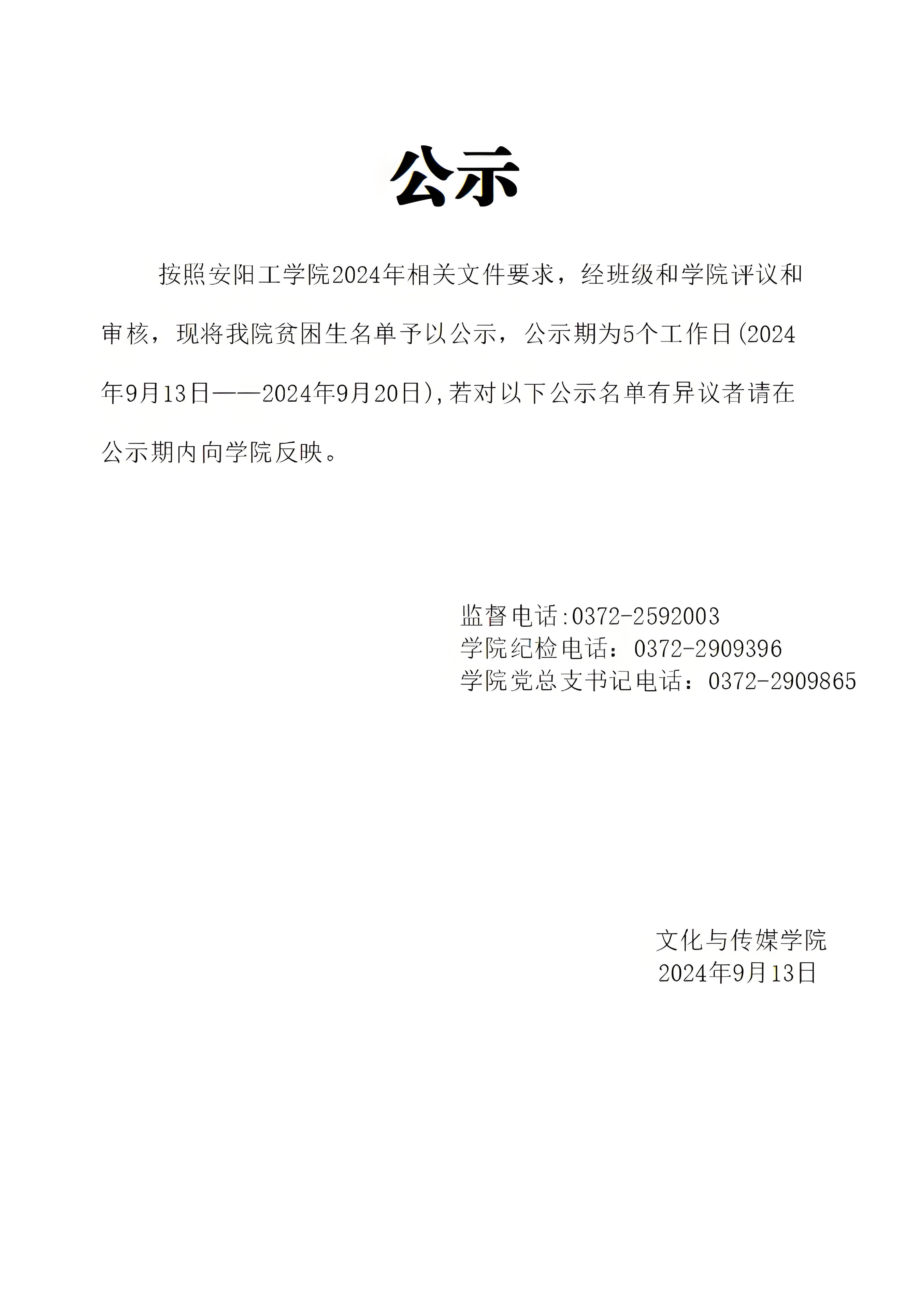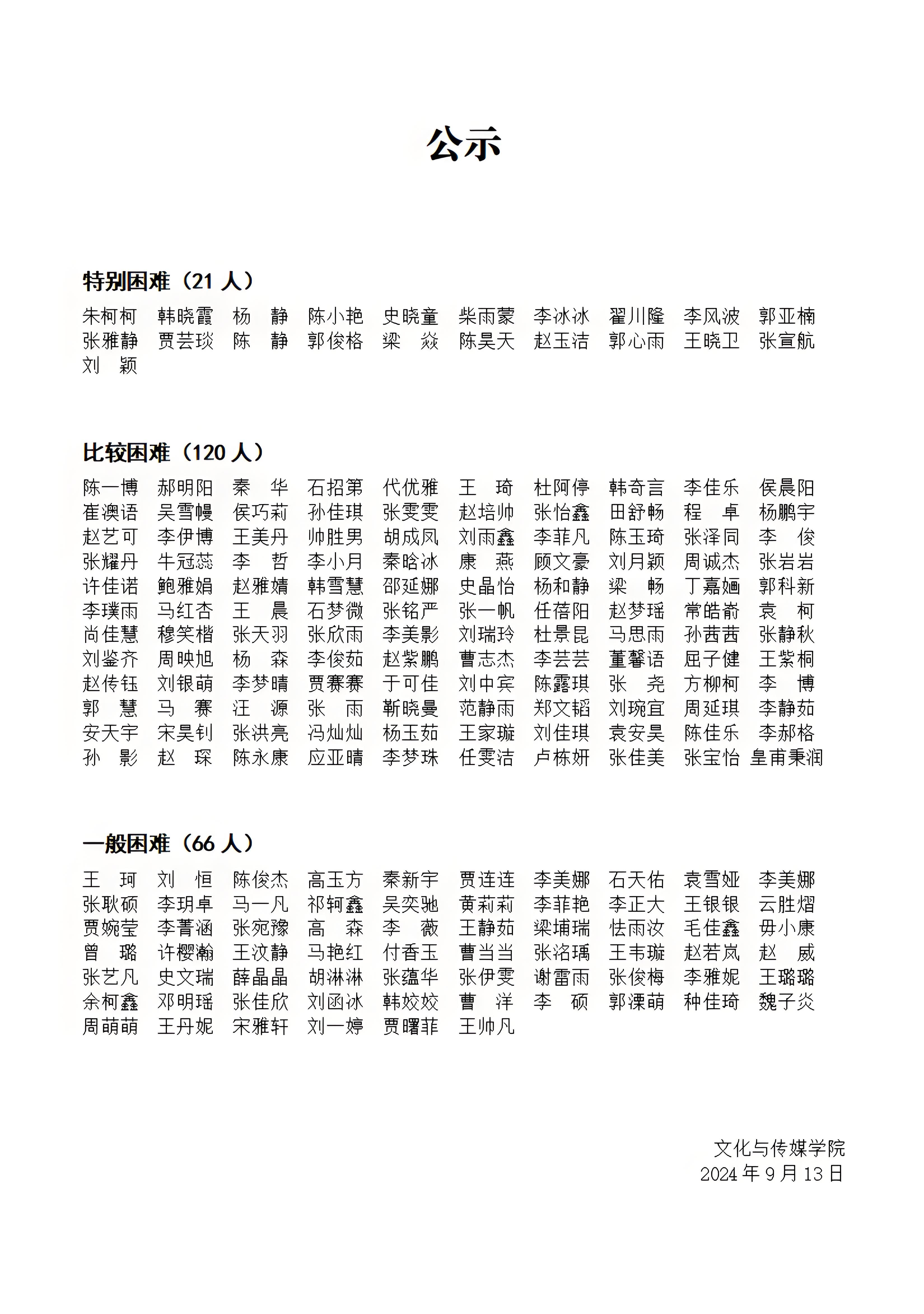2024年贫困生名单公示