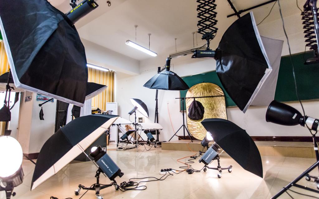 摄影实验室配有单反相机、影室闪光灯、柔光箱、影楼伞、束光罩、伞灯罩、静物台、电动背景等摄影配套设备。专业的灯光及摄影设备为摄影类、广告类课程提供良好的实验教学环境。
